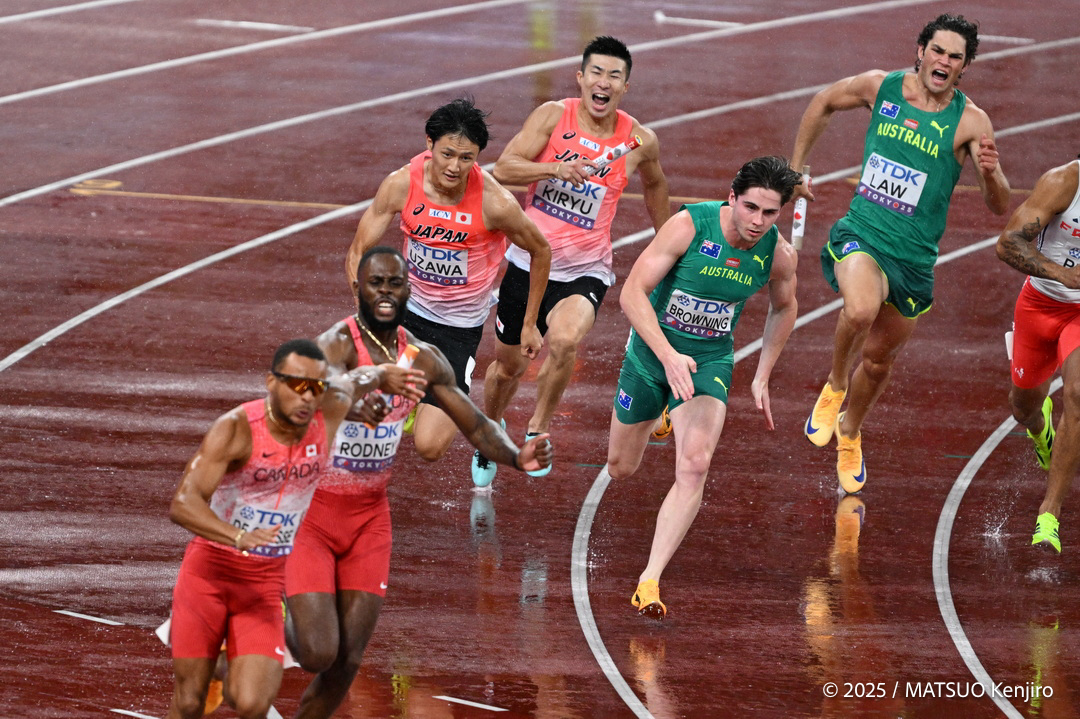 最終日は、激しい雨が降った。男子円盤投げ、女子走り高跳びは中断して、その間に男女のマイルリレー、400mリレーが行われた。パフォーマンスする人間が雨に濡れると、なぜか見ている方は盛り上がる。コンサートと一緒だ。雨にもマケズ……男子のマイルリレーは素晴らしいレースとなり、男子の「4継」も日本が決勝に残ったことで大いに盛り上がった。